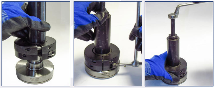 To remove the inner ring from the crankshaft, use the specific puller (IAME ATT-048X). The lip grabbing the spacer is necessarily thin, be careful to fit it exactly on the crankshaft. Tighten the 2 Allen screws M8x30, then tighten the M12 screw (Hex.19) until the complete extraction of the inner ring, blocking the puller body.